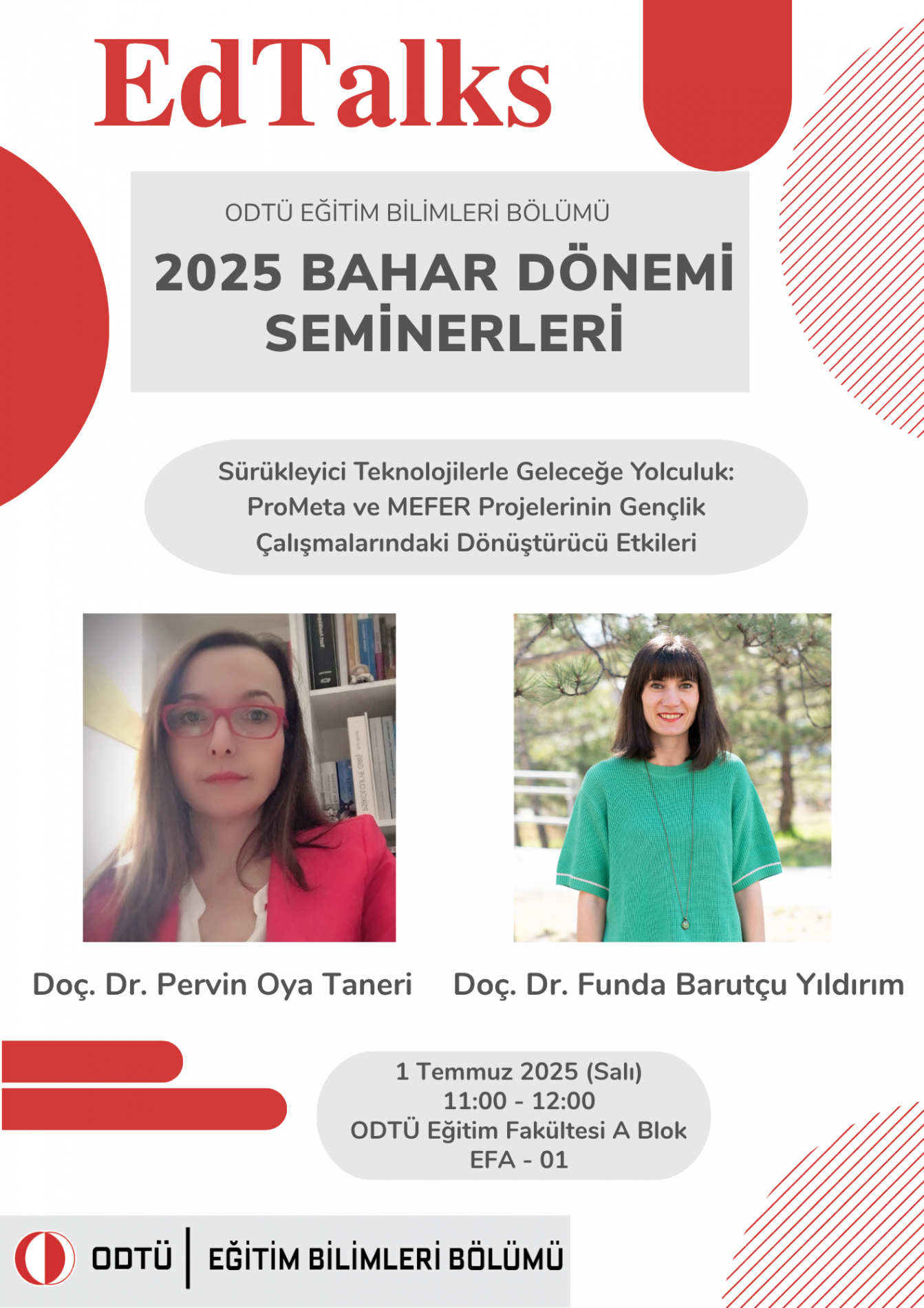 Eğitim Bilimleri Bölümü tarafından düzenlenen EdTalks seminerlerinin 2025 bahar dönemi üçüncü semineri, 1 Temmuz 2025 Salı günü saat 11:00 – 12:00 arası ODTÜ Eğitim Fakültesi, Eğitim Bilimleri Bölümü Öğretim Üyeleri Doç. Dr. Pervin Oya Taneri ve Doç. Dr. Funda Barutçu Yıldırım tarafından "Sürükleyici Teknolojilerle Geleceğe Yolculuk: ProMeta ve MEFER Projelerinin Gençlik Çalışmalarındaki Dönüştürücü Etkileri" başlığı ile düzenlenecektir. Etkinlik yüz yüze katılımla gerçekleştirilecektir.