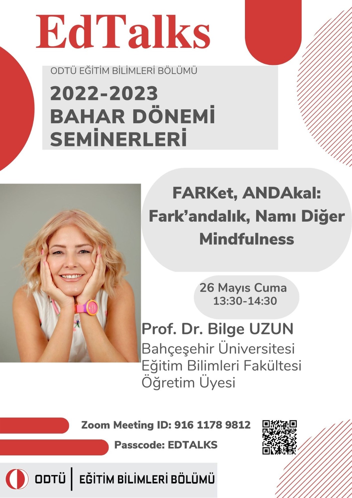 Değerli Fakülte Mensupları, Eğitim Bilimleri Bölümü tarafından düzenlenen EdTalks etkinliği kapsamında bugün, 26 Mayıs Cuma günü saat 13.30'da Hacettepe Üniversitesi Eğitim Fakültesi'nden Prof. Dr. Bilge Uzun tarafından "FARKet ANDAkal: Fark'andalık, Nam-ı Diğer Mindfulness" başlıklı bir seminer verilecektir. Etkinlik Zoom üzerinden online yapılacaktır. Ekte etkinliğin afişine ve etkinlik katılım bilgilerine ulaşabilirsiniz. Katılımlarınızı bekleriz. EBB EdTalks Düzenleme Ekibi Etkinlik Bilgisi: Tarih:26 Mayıs Cuma Saat: 13:30 EDTALKS-FARKet ANDAkal: Fark'andalık, Nam-ı Diğer Mindfulness https://zoom.us/j/91611789n812?pwd=MnhITFNpZWFidXFydVgwUmlHVlVVQT09 Meeting ID: 916 1178 9812 Passcode: EDTALKS |