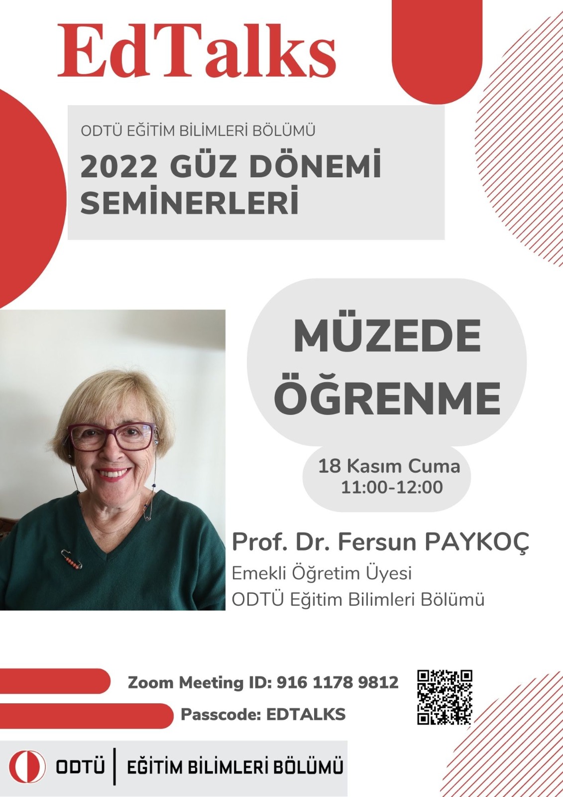Eğitim Bilimleri Bölümü tarafından düzenlenen EdTalks etkinliği kapsamında 18 Kasım 2022 saat 11:00’de emekli öğretim üyemiz Prof. Dr. Fersun Paykoç tarafından “Müzede Öğrenme” başlıklı bir seminer verilecektir. Etkinlik Zoom üzerinden online yapılacaktır. Ekte etkinliğin afişine ve etkinlik katılım bilgilerine ulaşabilirsiniz. Prof. Dr. Fersun Paykoç, TED Ankara Koleji’ni ve AFS Bursu ile ABD’de liseyi bitirdi. Hacettepe Üniversitesi Psikoloji Bölümü’nden Lisans ve Yüksek Lisans derecesi ile mezun oldu. 1971’de ODTÜ Eğitim Bölümü’ne asistan olarak girdi. Eğitimde Program Geliştirme ve Değerlendirme alanında akademik kariyerine devam etti. ODTÜ’de bu alanda öğretim, toplumsal görevler, araştırmalar ve yayınlar yaparak 33 yıl çalıştı. 2004 yılında emekli oldu. 2007 yılına kadar yarı zamanlı olarak ders vermeye devam etti. Bugüne kadar uluslararası ve ulusal projelerde, farklı eğitim kurumlarında, özel ve resmi kurumlarda aktif öğrenme, etkili öğretim, eğiticilerin eğitimi, program geliştirme ve değerlendirme, müze eğitimi alanlarında eğitim uzmanı ve danışman olarak çalıştı ve eğitim materyalleri geliştirdi. Not: Güz döneminde yapılacak seminerlerin takvimine ekteki afişten ulaşabilirsiniz. Etkinlik Bilgisi: EDTALKS-Müzede Öğrenme Katılımlarınızı bekleriz. Eğitim Bilimleri Bölümü EdTalks Koordinasyon Grubu |