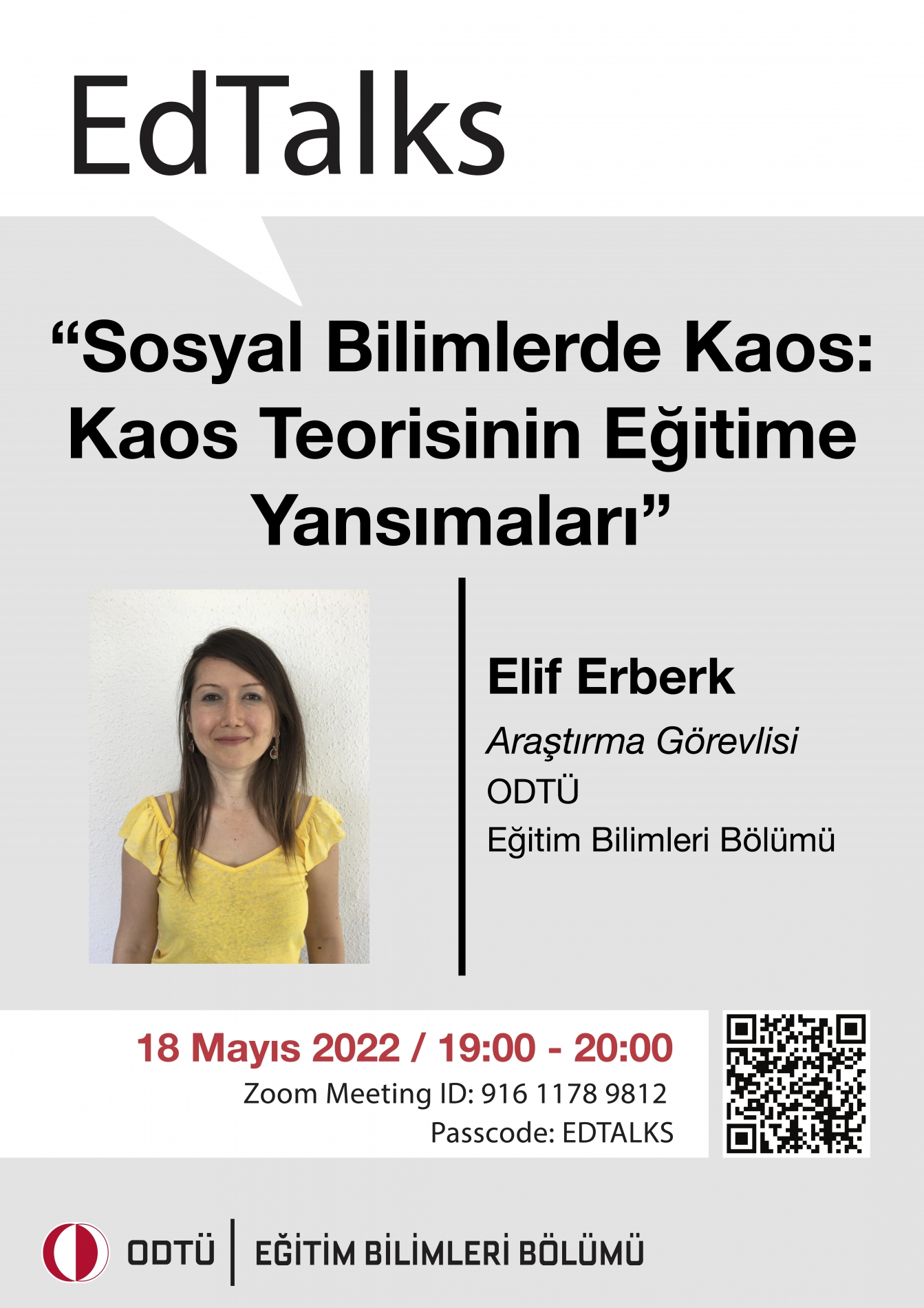 Eğitim Bilimleri Bölümü tarafından düzenlenen EdTalks etkinliği kapsamında 18 Mayıs Çarşamba günü Araş. Gör. Elif Erberk tarafından Sosyal Bilimlerde Kaos: Kaos Teorisinin Eğitime Yansımaları başlıklı bir seminer verilecektir. Etkinlik zoom üzerinden yapılacaktır. Ekte etkinliğin afişine ve etkinlik katılım bilgilerine ulaşabilirsiniz.