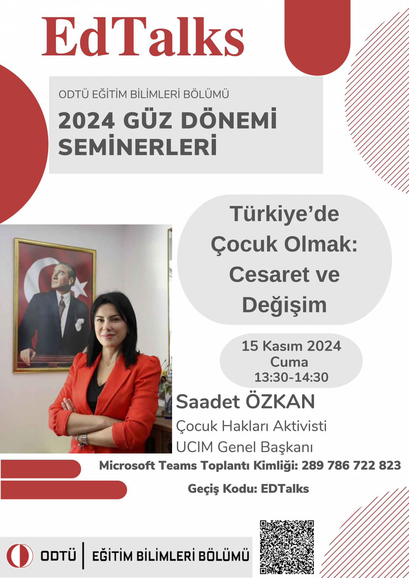 Eğitim Bilimleri Bölümü tarafından düzenlenen EdTalks seminerlerinin 2024 güz dönemi ilk semineri, yarın 15 Kasım 2024 Cuma günü saat 13:30-14:30'da UCIM Genel Başkanı ve Çocuk Hakları Aktivisti Sayın Saadet Özkan tarafından “Türkiye'de Çocuk Olmak: Cesaret ve Değişim” başlığı ile düzenlenecektir. Etkinlik Microsoft Teams üzerinden çevrimiçi yapılacaktır. Ekte etkinliğin afişine ve etkinlik katılım bilgilerine ulaşabilirsiniz. Sn. Saadet Özkan, 5 Haziran 1978'de İzmir'de doğdu. Lisans eğitimini Anadolu Üniversitesi Okul Öncesi Eğitim Öğretmenliği bölümünde tamamladı. Ardından Anadolu Üniversitesi Halkla İlişkiler ve İletişim bölümünden mezun oldu. Lisansüstü eğitimini ise Klinik Psikoloji alanında yapmakta olup tez sürecindedir. İzmir Menderes’te 6 öğrenciye cinsel istismarda bulunan okul müdürünün yargılanmasını sağlayarak 82 yıl 6 ay hapis cezası almasını sağlayan Saadet Özkan, verdiği mücadeleyle dünyaya örnek oldu. Katılımlarınızı bekleriz. EBB EdTalks Düzenleme Ekibi Etkinlik Bilgisi:“Türkiye'de Çocuk Olmak: Cesaret ve Değişim” Tarih: 15 Kasım 2024 Cuma Saat: 13:30-14:30 |
