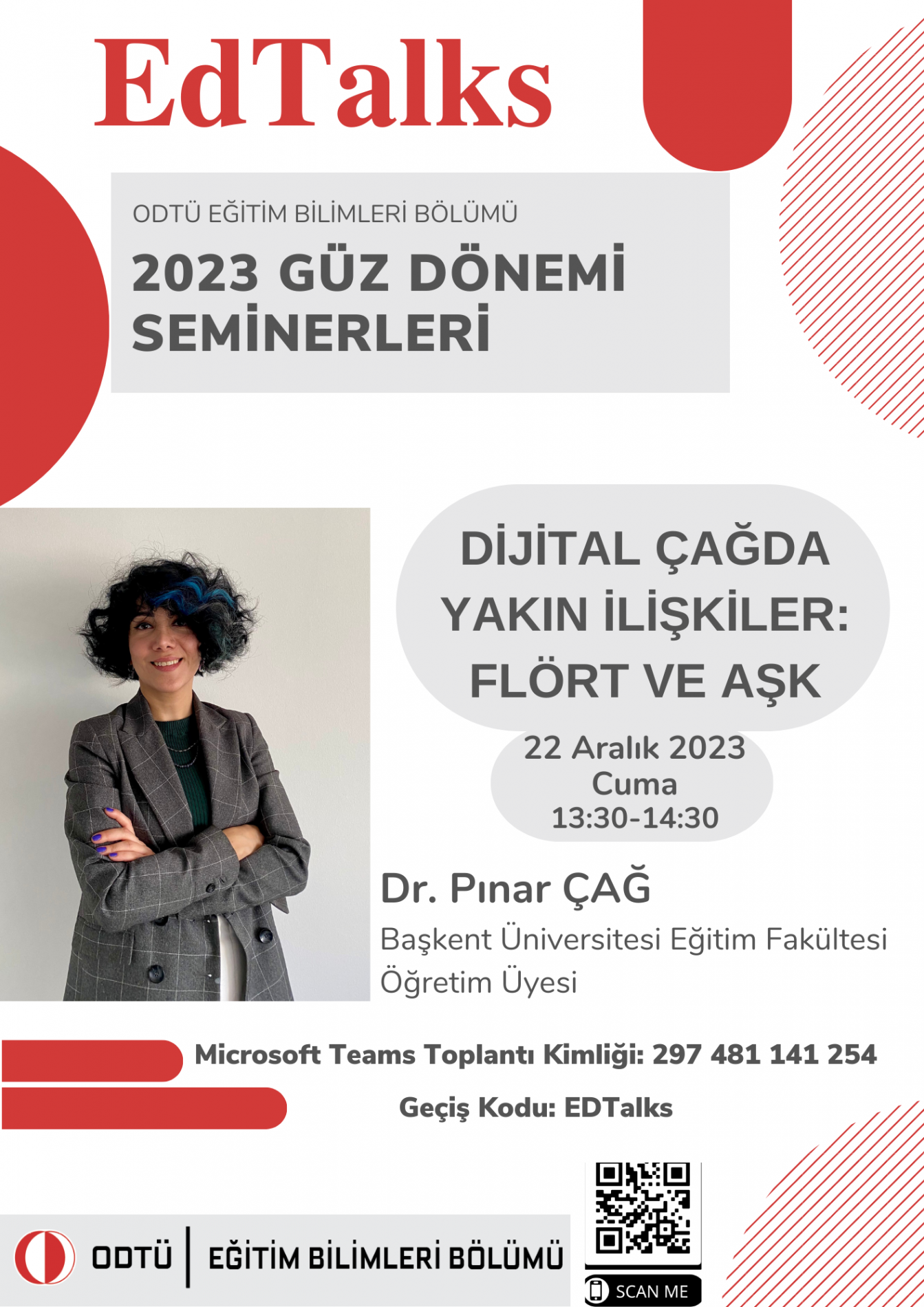 Eğitim Bilimleri Bölümü tarafından düzenlenen EdTalks etkinliği kapsamında, 22 Aralık Cuma günü saat 13:30-14:30'de Sayın Dr. Pınar Çağ tarafından "Dijital Çağda Yakın İlişkiler: Flört ve Aşk" başlıklı bir seminer verilecektir. Etkinlik Microsoft Teams üzerinden online yapılacaktır. Ekte etkinliğin afişine ve etkinlik katılım bilgilerine ulaşabilirsiniz. Katılımlarınızı bekleriz. EBB EdTalks Düzenleme Ekibi Etkinlik Bilgisi:”Dijital Çağda Yakın İlişkiler: Flört ve Aşk” Tarih: 22 Aralık 2023, Cuma Saat: 13:30-14:30 Microsoft Teams Toplantısı Oturuma Katılma Seçenekleri: Bilgisayarınızda veya mobil uygulamanızda katılın Toplantıya katılmak için buraya tıklayın Toplantı Kimliği: 297 481 141 254 Geçiş kodu: EDTalks |